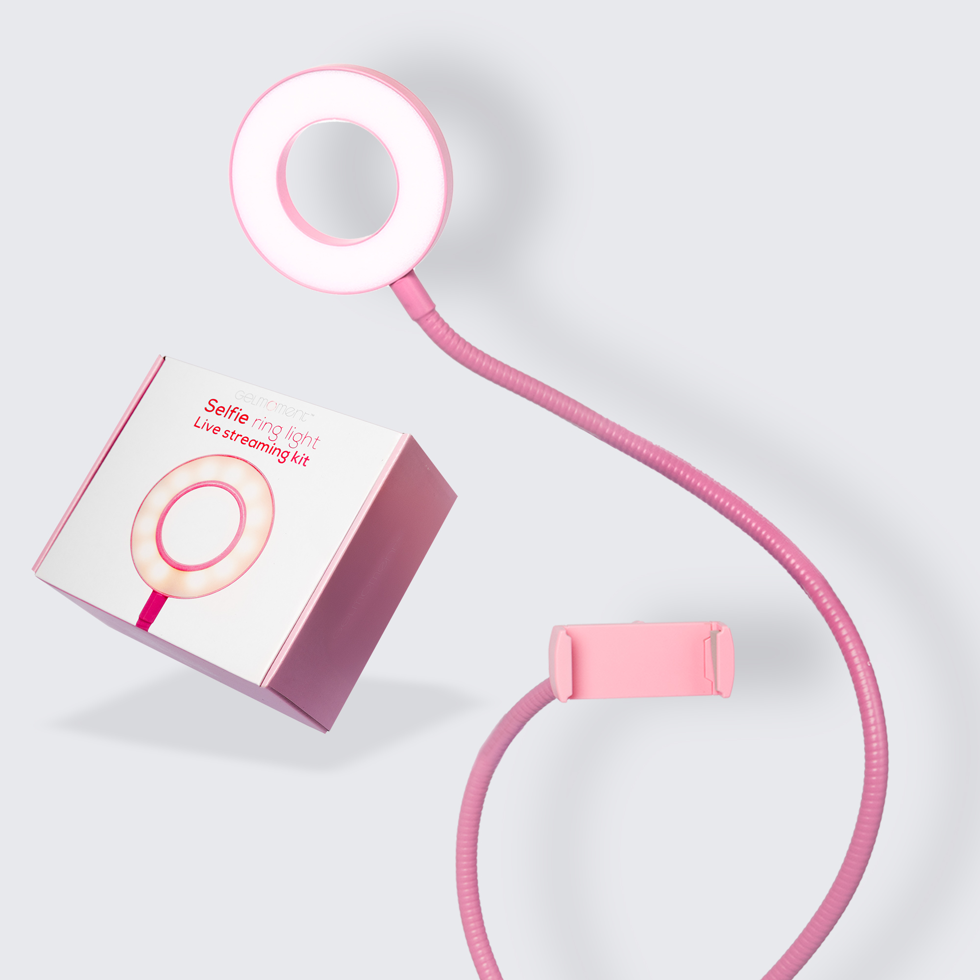 Do you want to be able to record or take pictures like the pros? Use this GelMoment clip-on combination phone holder and selfie ring light. With flexible goose-neck holder and light, you can direct your cell phone toward you for hands-free selfies and videos, or down toward your tabletop for close-up manicure pictures or tutorials. Powered by any USB power source, its adjustable lighting in 3 colours and 10 levels of brightness means you will be able to create stunning visuals in any environment. USB powered.